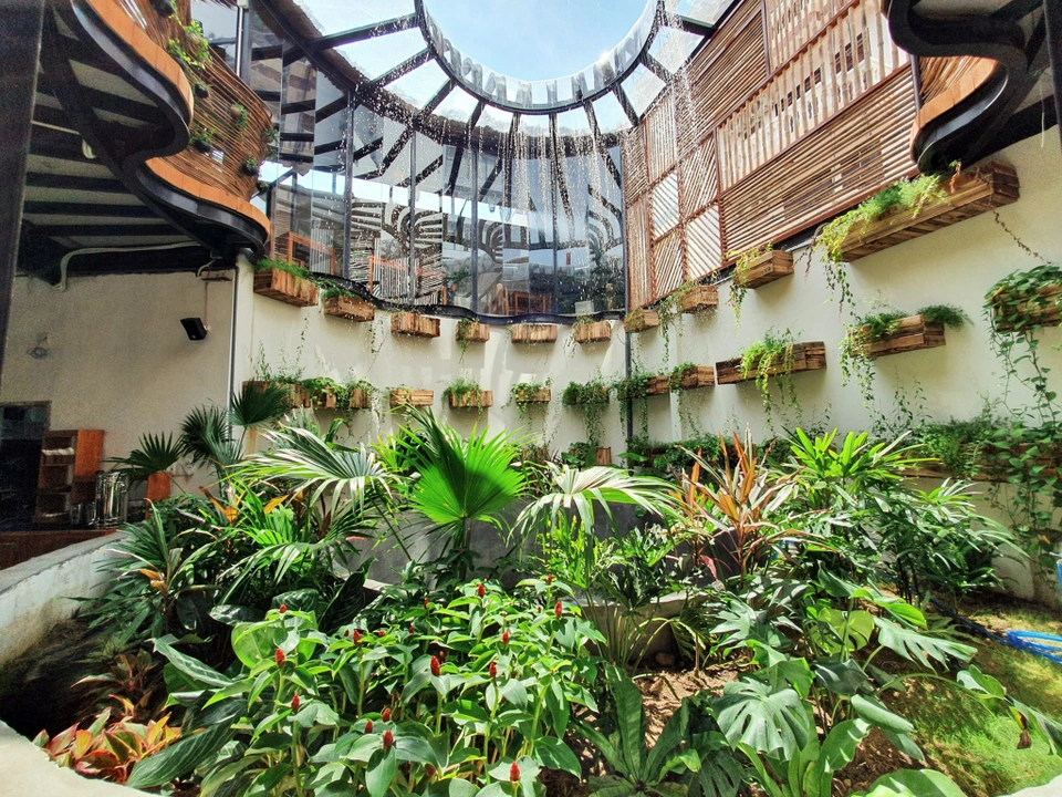 Kết hợp hồ cá mini, thác nước, cây xanh và đèn trang trí tạo bầu không khí thư giãn.
